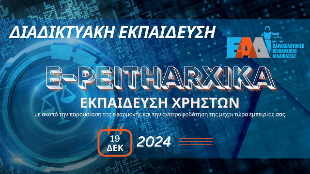 Στις 19 Δεκεμβρίου 2024 πραγματοποιήθηκε διαδικτυακό σεμινάριο (webinar) σχετικά με την ηλεκτρονική εφαρμογή «e-Peitharxika» της Εθνικής Αρχής Διαφάνειας. Στόχος της εφαρμογής είναι η συστηματική παρακολούθηση των πειθαρχικών υποθέσεων της ελληνικής δημόσιας διοίκησης (τόσο της πειθαρχικής διαδικασίας όσο και της πειθαρχικής προδικασίας). Το webinar διοργανώθηκε από τον Υποτομέα Παρακολούθησης και Ελέγχου Πειθαρχικών Διαδικασιών της Ε.Α.Δ. και τη Δ/νση Ηλεκτρονικής Διακυβέρνησης της Αρχής. Σκοπός της εκπαιδευτικής δράσης ήταν η παρουσίαση της εφαρμογής «e-Peitharxika» και η ανατροφοδότηση από τους χρήστες της, δεδομένης της επικείμενης συμπλήρωσης ενός έτους από την πλήρη παραγωγική λειτουργία της.